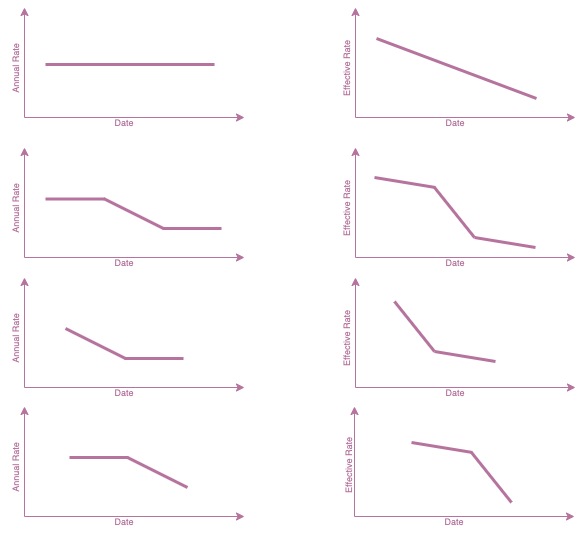 With this type of fee lenders can have a full control over how the fee rate for that pool decays. Here are some of the behaviors that are achievable. You can see the way an effective rate will behave in order to achieve different APR behavior as the loan progresses over time.&#x20;