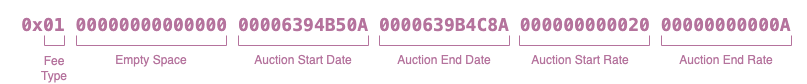 <table><thead><tr><th width="121">Bytes</th><th width="174">Name</th><th>Purpose</th></tr></thead><tbody><tr><td>0-5</td><td>Auction End Rate</td><td>Rate at which the auction ends. Rate for any timestamp past the auction end rate will be equal to this value. Passed in hex.</td></tr><tr><td>6-11</td><td>Auction Start Rate</td><td>Rate at which the auction starts. Rate for any timestamp before the auction start rate will be equal to this value. Passed in hex.</td></tr><tr><td>12-17</td><td>Auction End Date</td><td>Time at which the auction decay rate will stop. </td></tr><tr><td>18-23</td><td>Auction Start Date</td><td>Time at which the auction decay rate will start.</td></tr><tr><td>24-30</td><td>Free Space</td><td>Can be used for passing more info if ever required.</td></tr><tr><td>31</td><td>Fee Type</td><td>Type of the fee rate behavior.</td></tr></tbody></table>